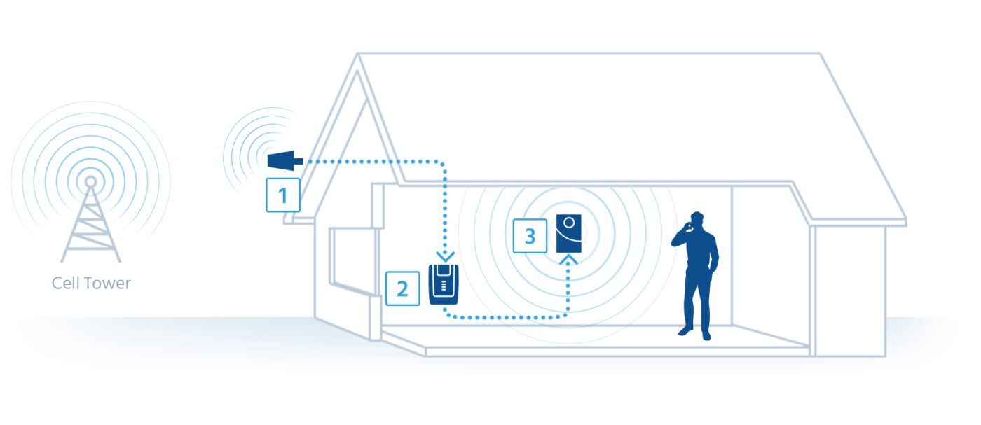 ② The signal booster amplifies the outside signal and sends it to one or more inside antennas.